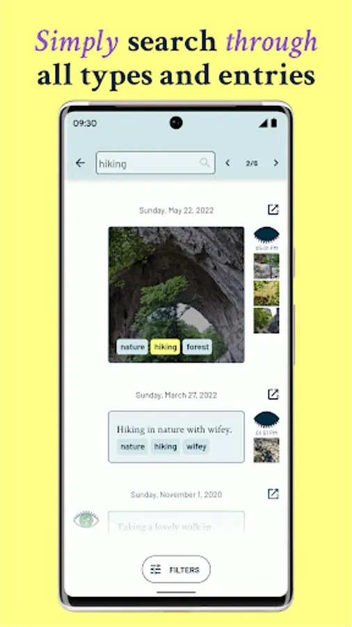 * Search all entries by scrolling your timeline, or by typing in search bar.
