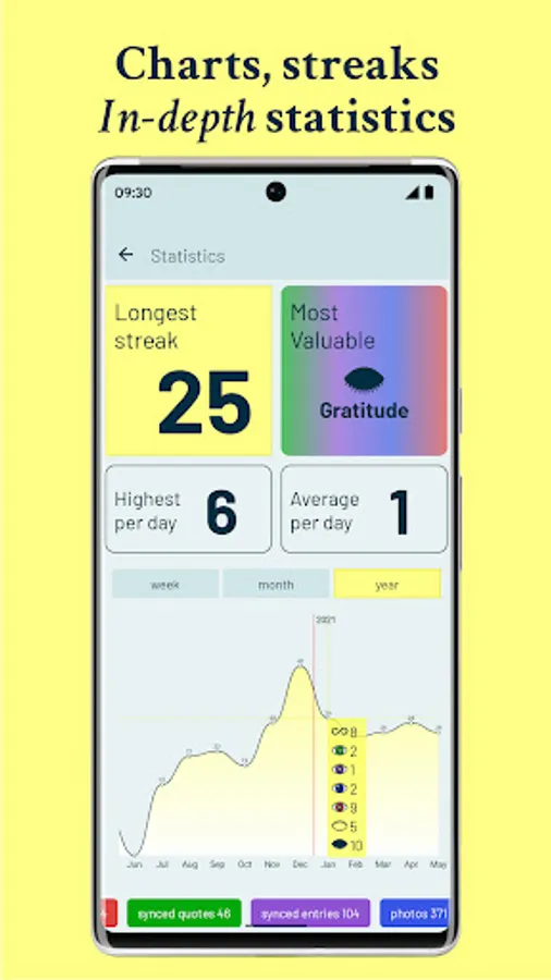 * In-depth Statistics show you your: longest streak, days with highest number of entries,