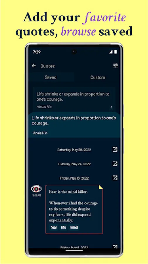 * See all quotes, days you saved them on and comments you’ve made listed under Quotes.