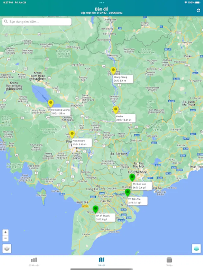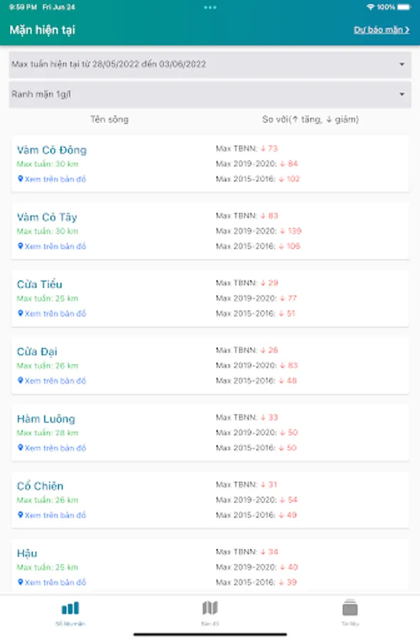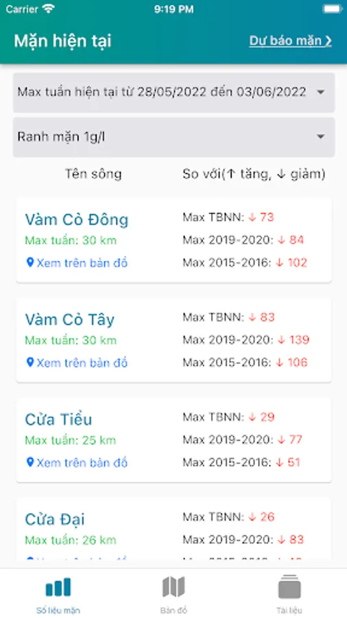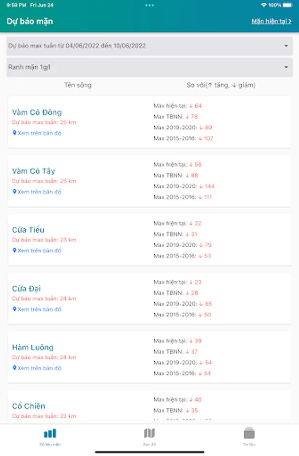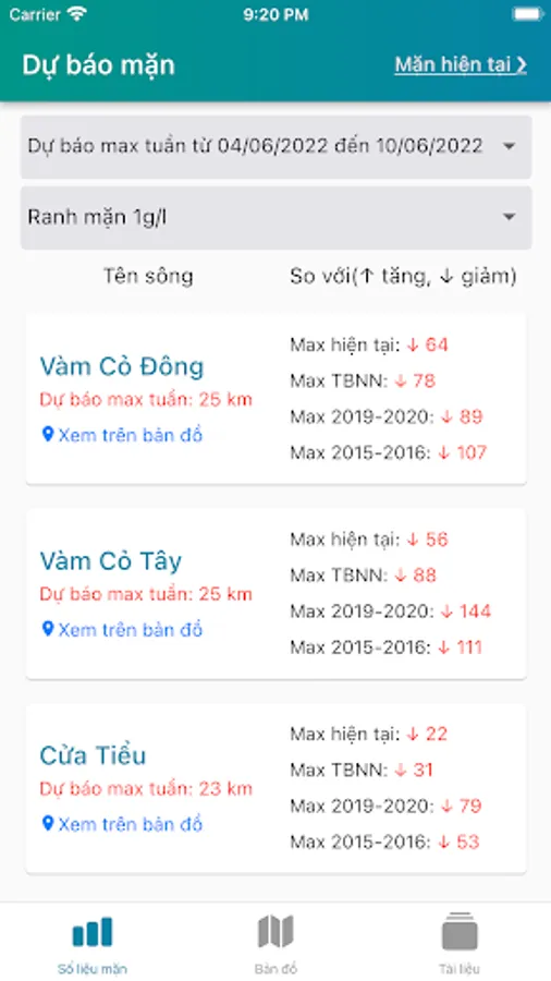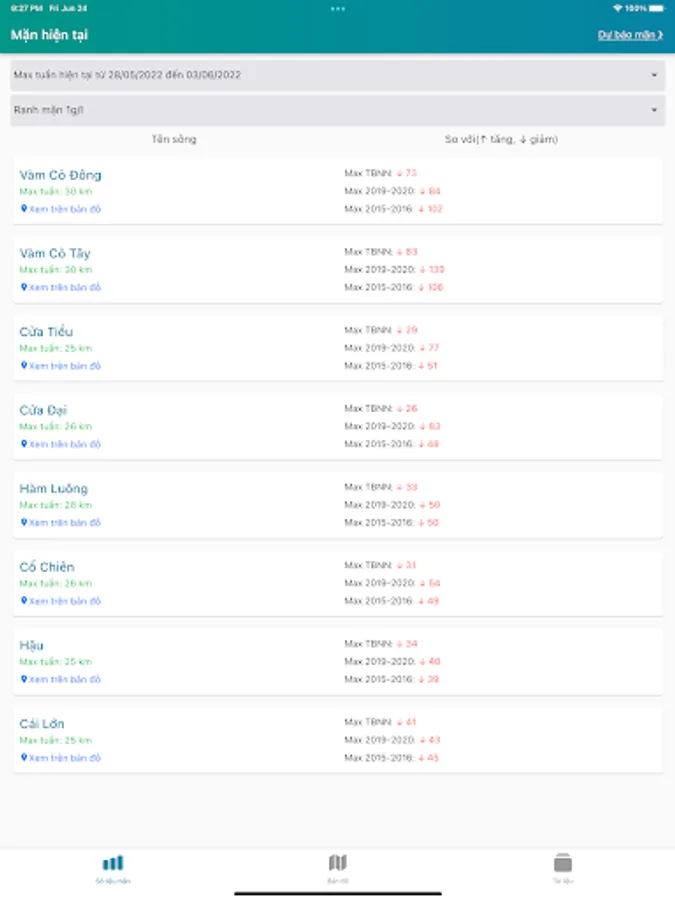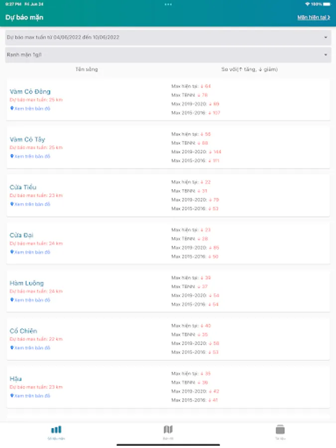 The application provides the following functions: Look up salinity data on rivers in the Mekong Delta; look up salinity data by week, month, year and compare with the minimum and maximum average values; The function of looking up maps, overlaying saltwater intrusion data and thematic data; look up documents at all levels on water resource management.