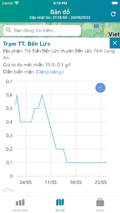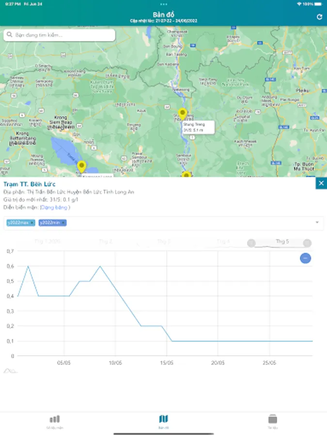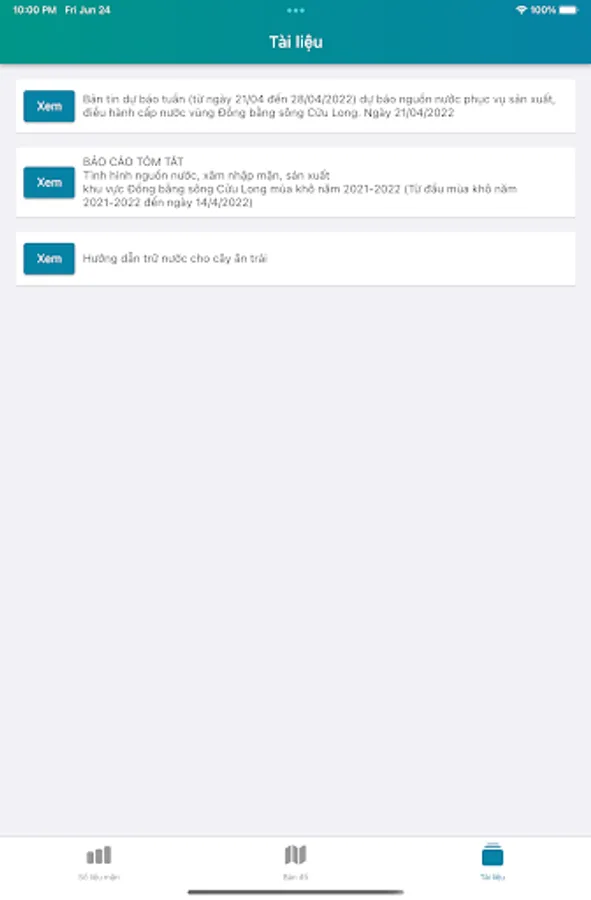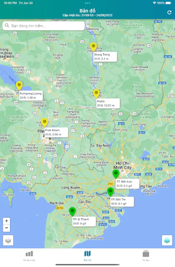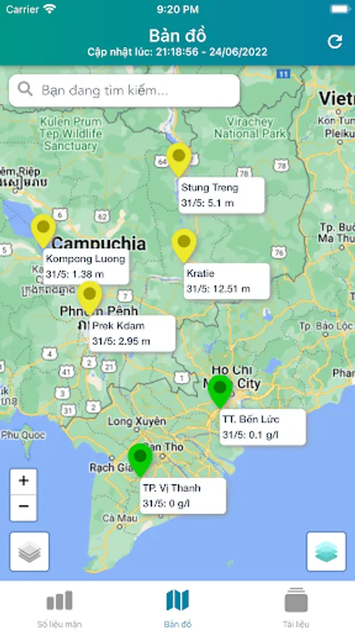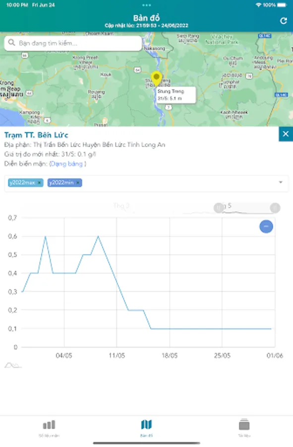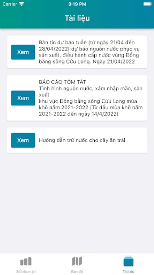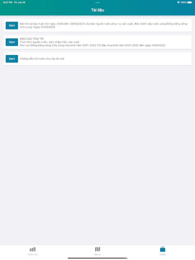 The application provides the following functions: Look up salinity data on rivers in the Mekong Delta; look up salinity data by week, month, year and compare with the minimum and maximum average values; The function of looking up maps, overlaying saltwater intrusion data and thematic data; look up documents at all levels on water resource management.
