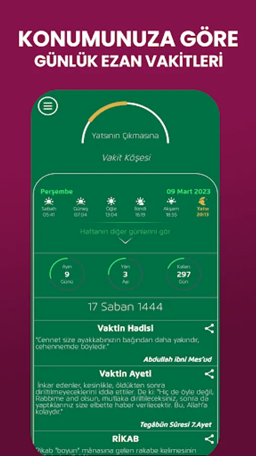Prayer Times that can be used by people who are looking for a prayer alarm application for Android: You can follow the prayer times by creating a prayer alarm for 5 different prayers thanks to our Azan, Quran application.