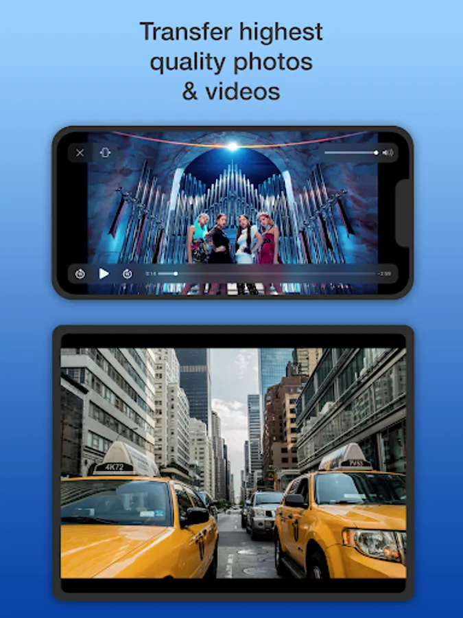 • Your files, documents, music, photos and videos are transferred directly from device to device using your local WiFi network. They are not stored in an external server and they never leave your local WiFi network keeping your photos safe.