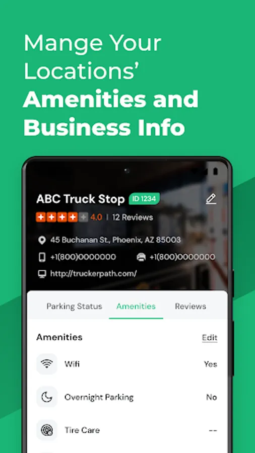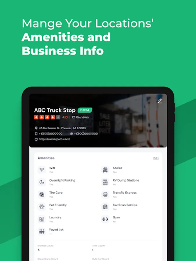 - Manage your locations’ amenities and business info in the Trucker Path app
