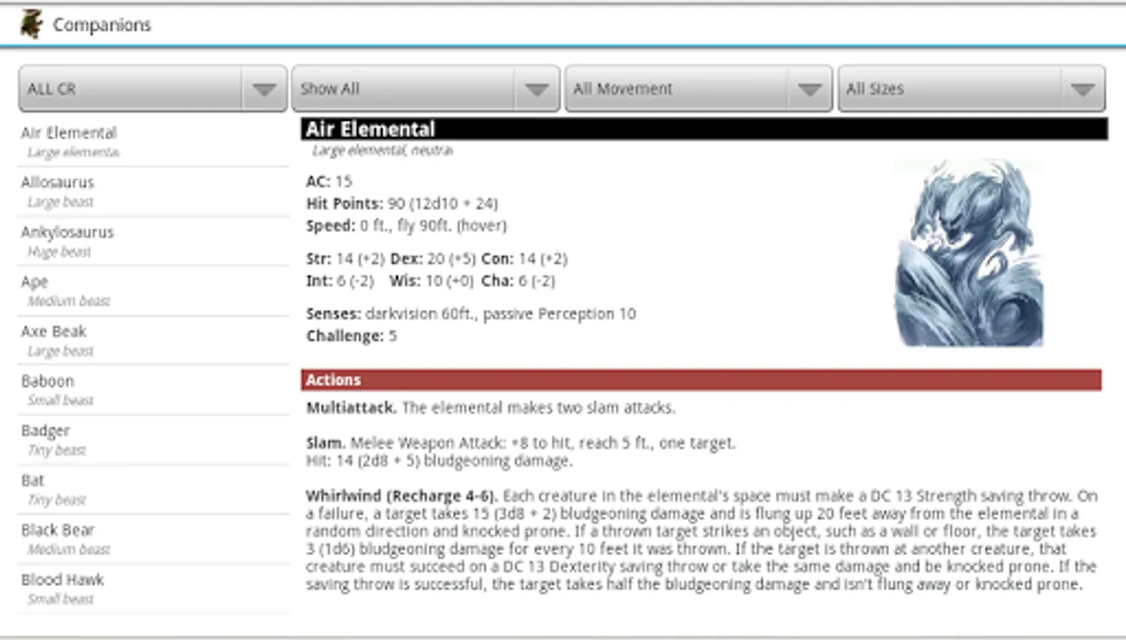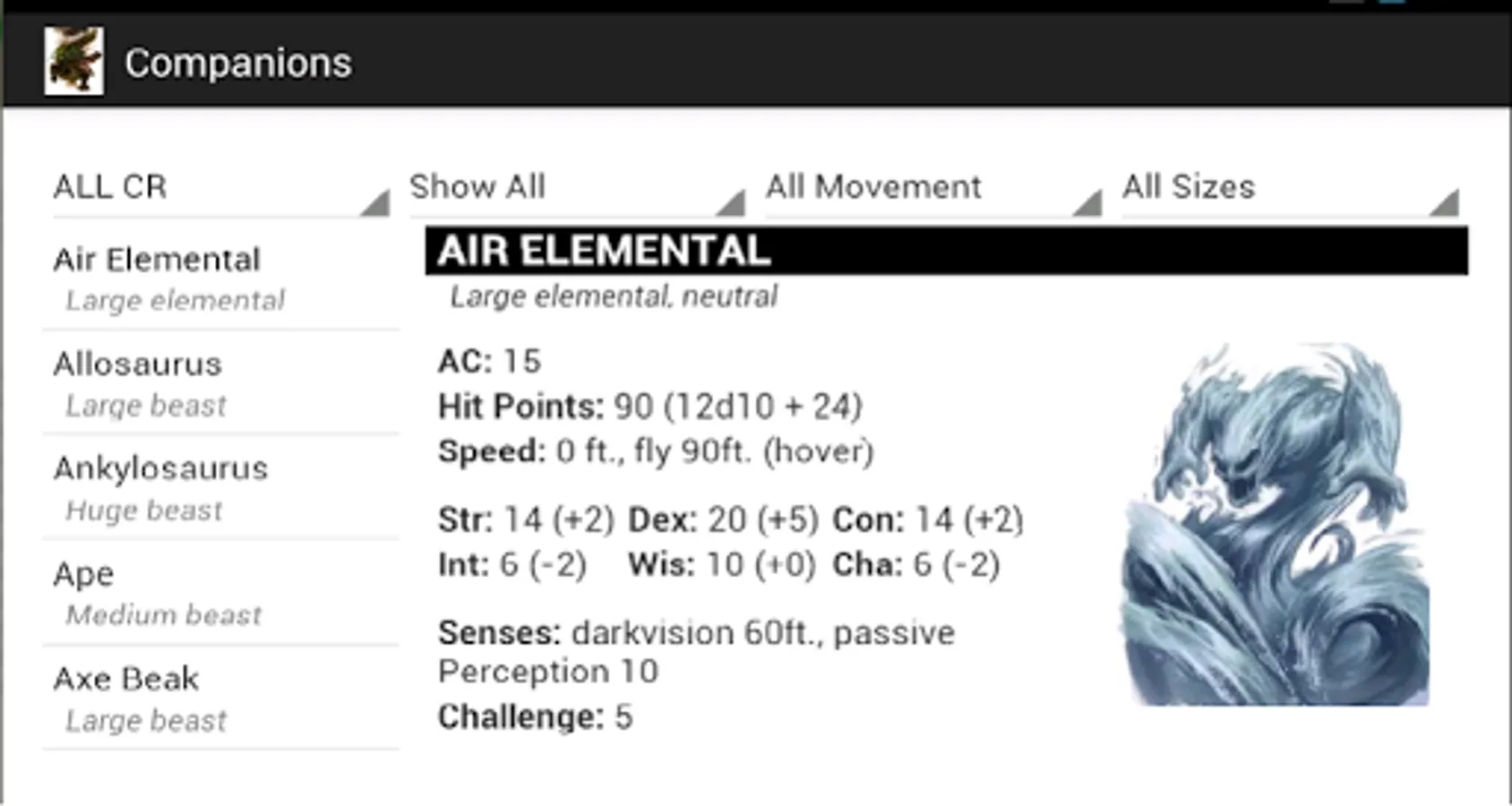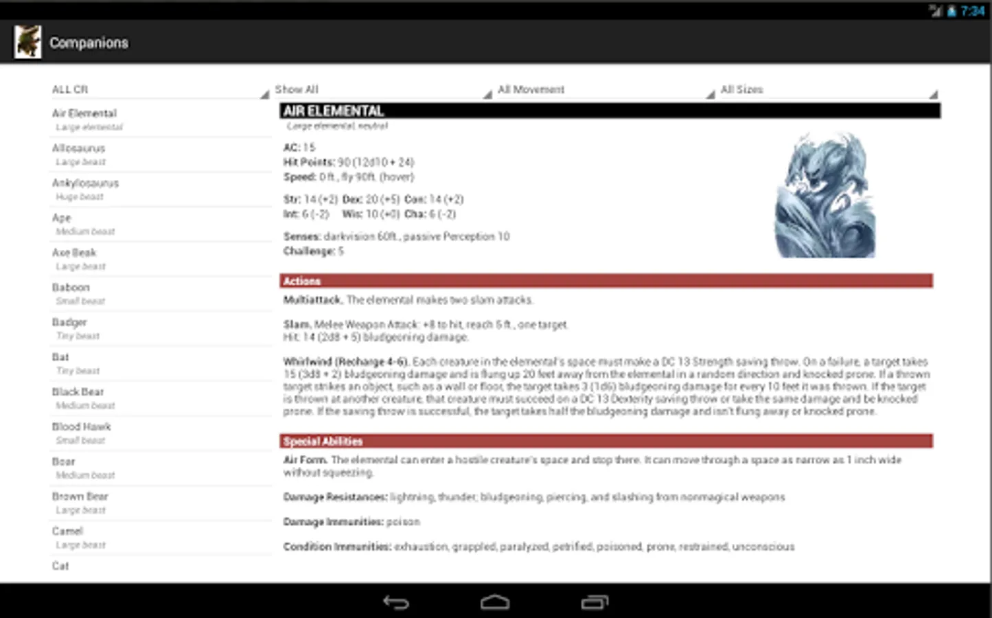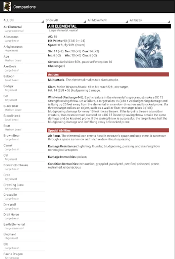 Sort list by challenge rating, type, size, and movement type.