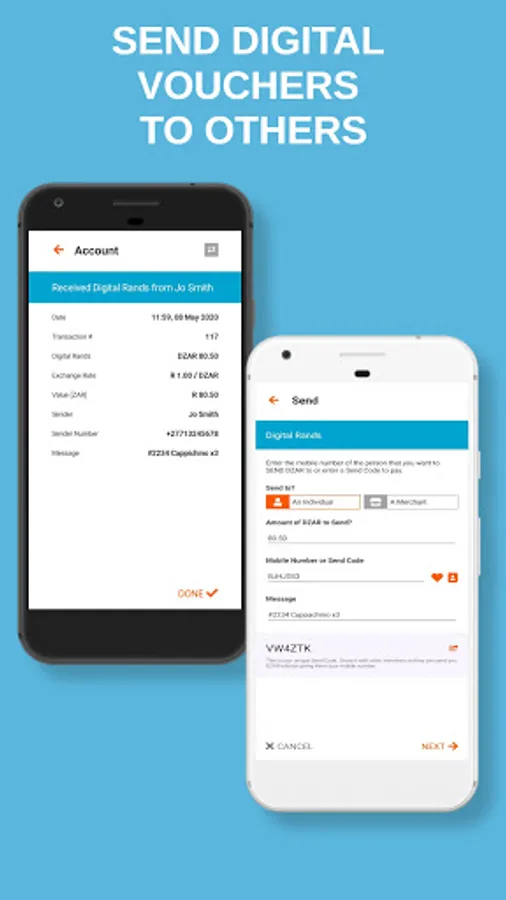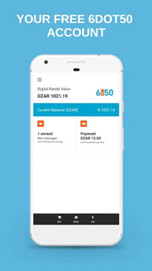 SEND Digital Rands to the mobile number or SEND CODE of any other 6DOT50 user for FREE.
