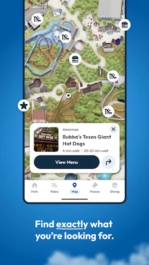 • Browse restaurant menus and place your order at select locations from anywhere in the park
