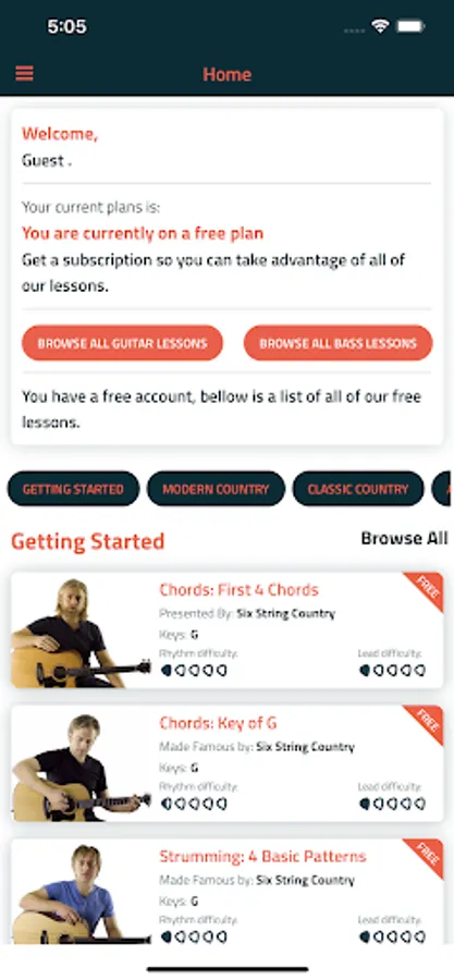 Learn your favorite songs with Six String Country's interactive guitar lessons. With well over 500 song lessons to choose from there are plenty of options in modern country, classic country, alternative and red dirt country, blues, fingerstyle guitar, and more. Each song lesson comes with chord charts, tabs, and full demonstrations on acoustic and electric, and break out, note-by-note instruction.