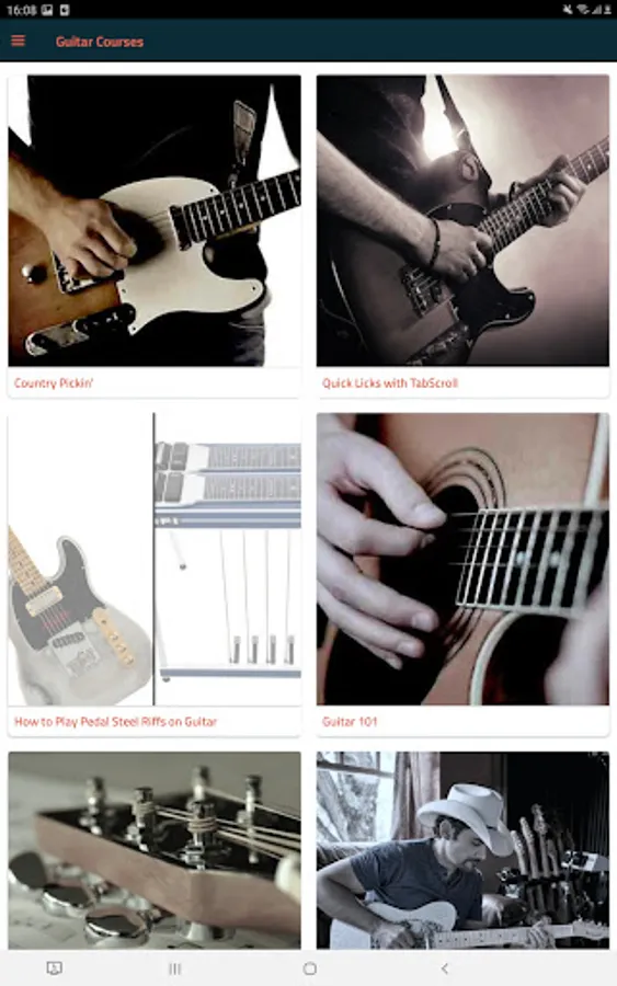 Add songs you want to learn to your favorites lists, and move them to your conquered list when you've mastered it. Six String Country offers 8 full length guitar courses and master classes. Guitar 101 is designed to be a resource from the day you bring home your first guitar. From there, choose from courses in beginning improvisation and soloing, a country pickin' guitar course, a guitar theory workshop, an acoustic fingerstyle course, or master classes in Chet Atkins style, Jerry Reed's style, or the Total Electric Blues Guitar Master Class.