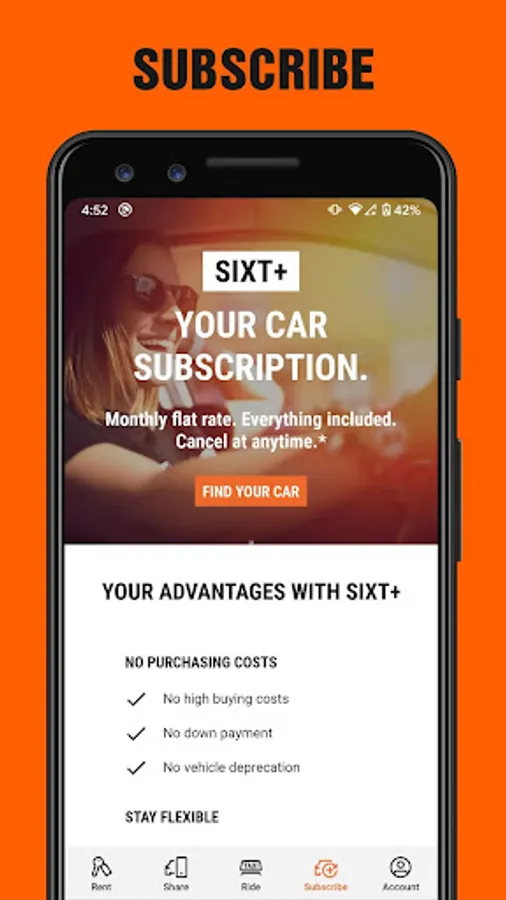 With the SIXT App, you can book a rental car in just a few seconds! Get access to all our car rental offers, find information about the nearest stations and how to get to them, select and reserve your desired car, and stay signed into your SIXT account to manage all reservations even faster.