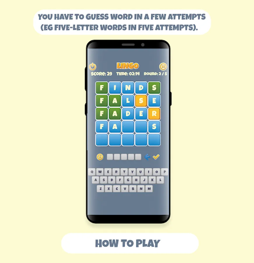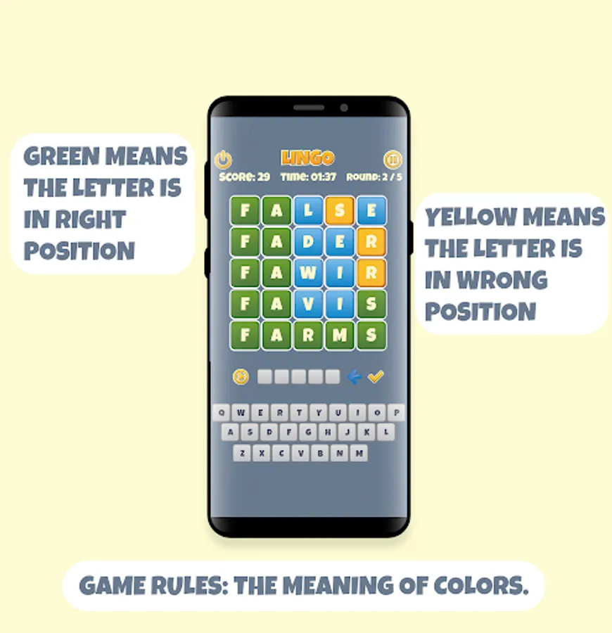 Lingo is a word game inspired by a popular game show in which you guess the words. Your task is to guess five-letter words (main game mode).