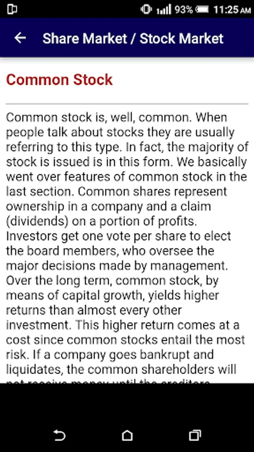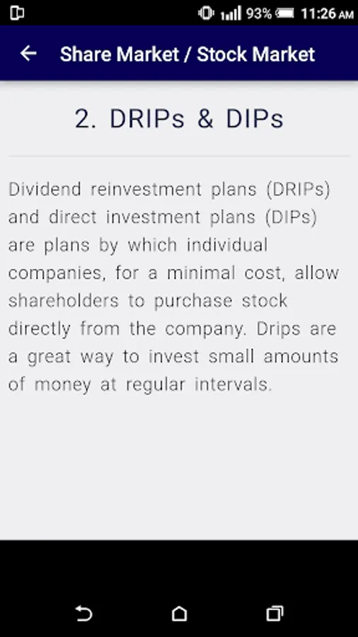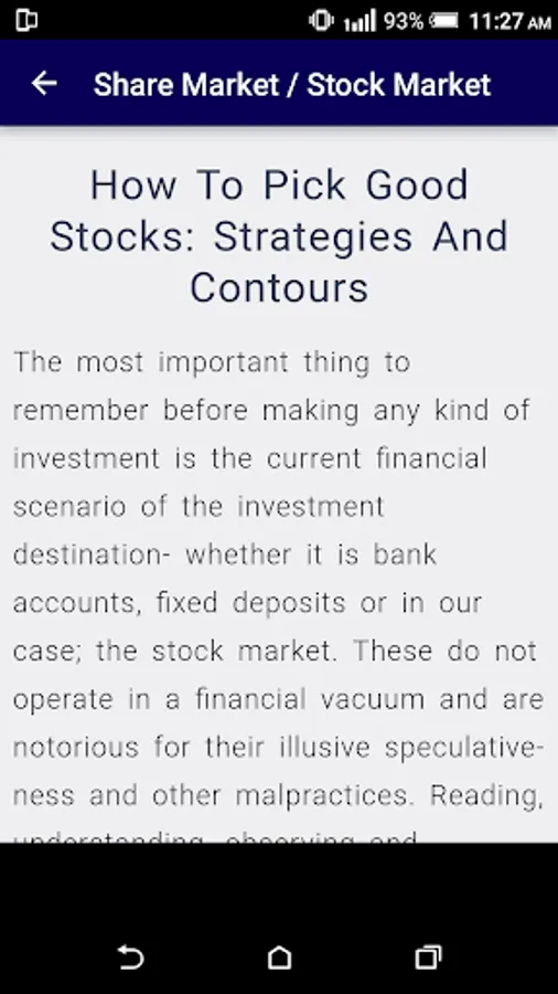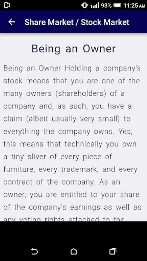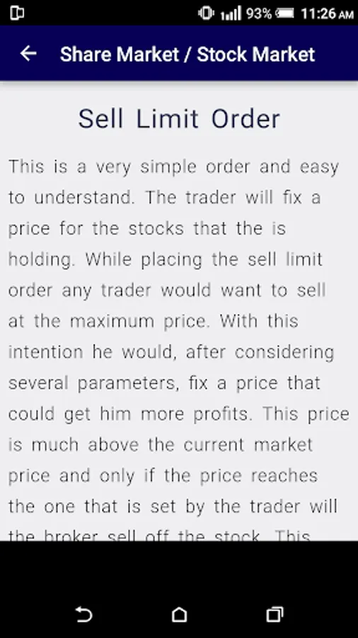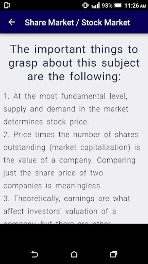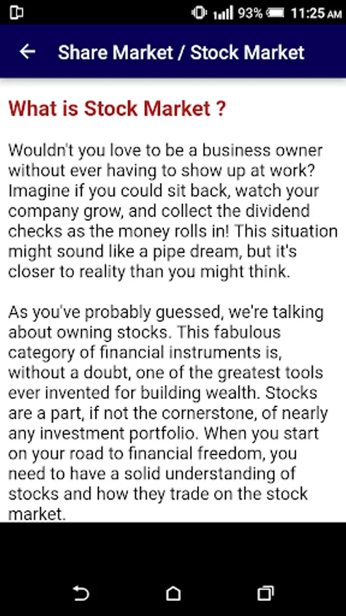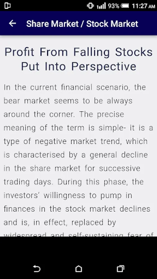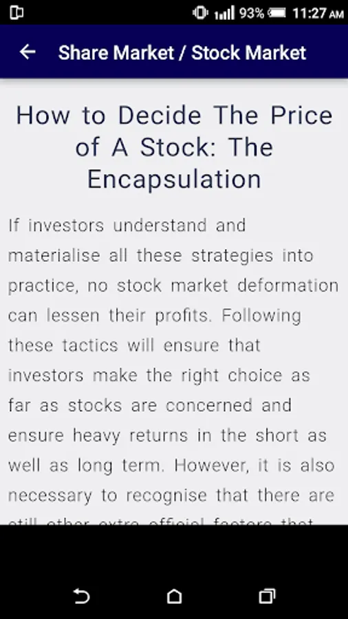 The app encourage readers to develop their own personal investment strategy and style through observation and learning .This application gives you the full idea about the share market with the help of this you can learn this in easy and new way.Special spotlight sections look at innovative new investment vehicles such as SPDRs, and provide an extensive analysis of changes in the market following the financial crisis of 2008. If you really want to learn just download the app and become the king of market.