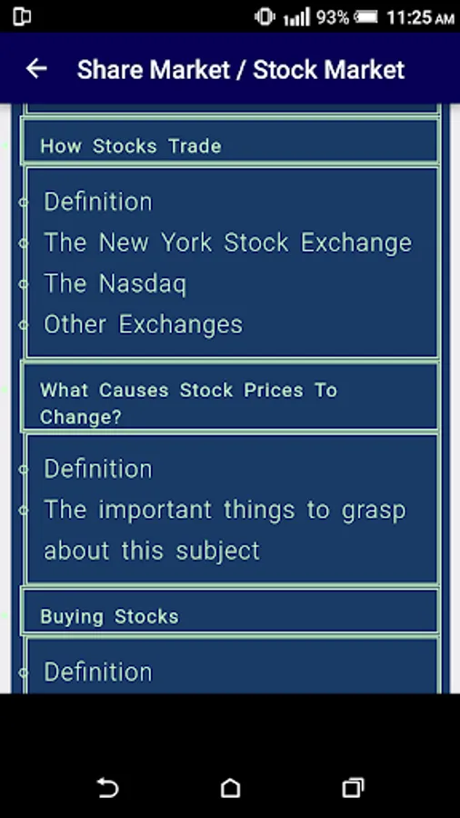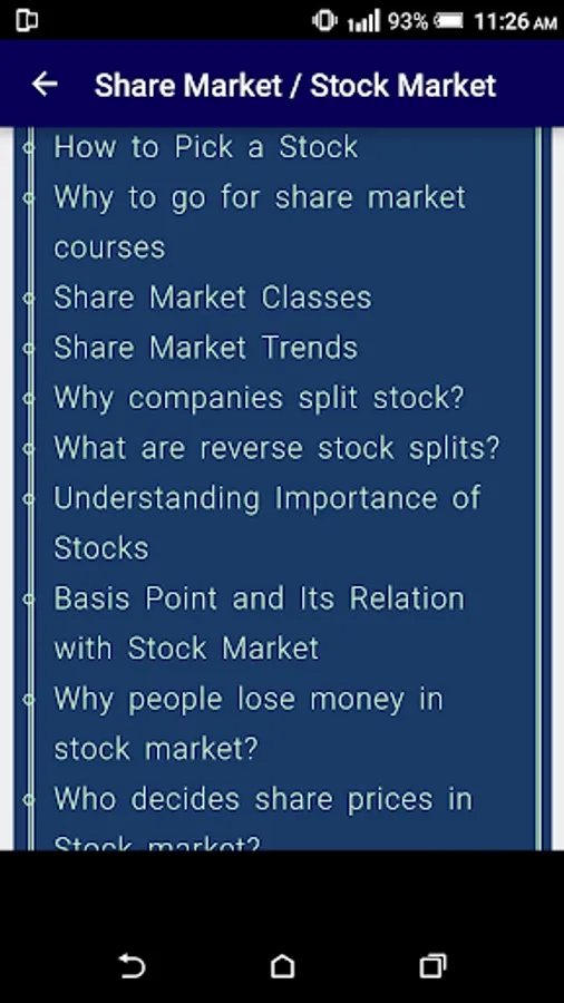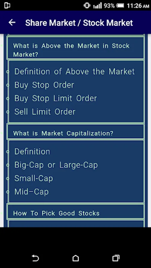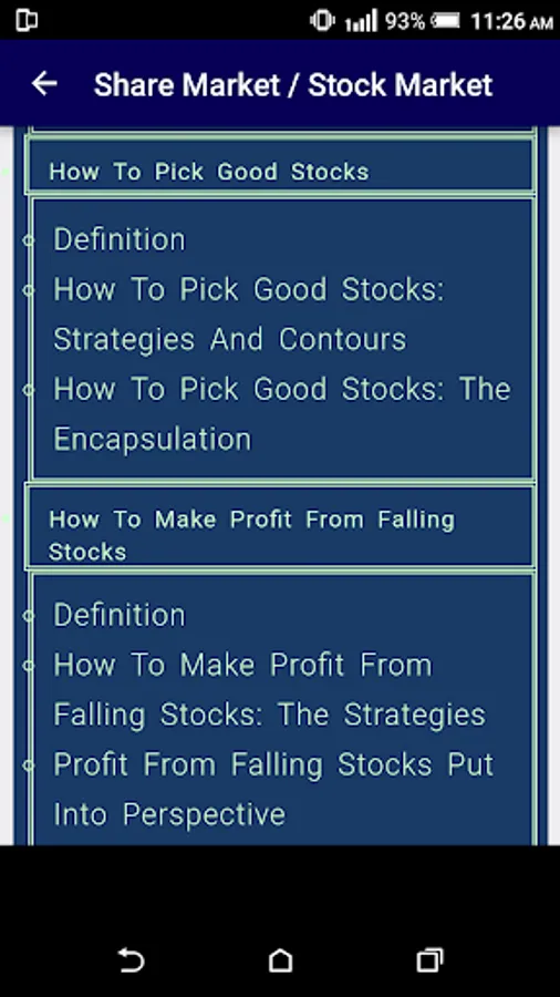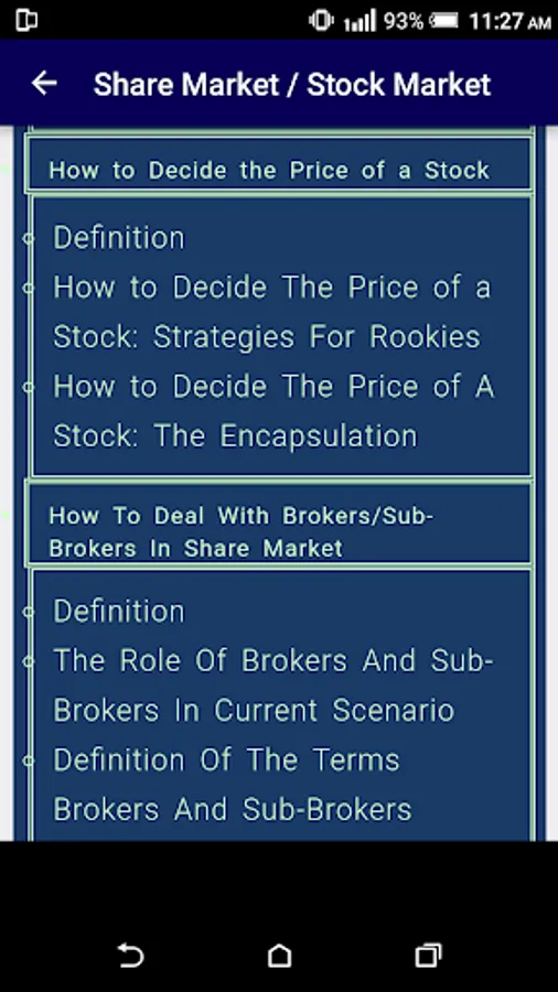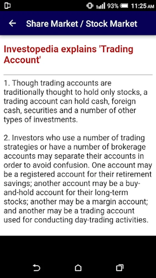 Many people think to invest their money in stock market (share bazar), commodity and mutual funds but he don't know how to do this or worry about fraud. This app offers the basic and advanced lessons of investing in those areas. If you are new in selling and buying the shares, equities and commodity then you should look out the basic info of how to open the trading account, and further can learn following: