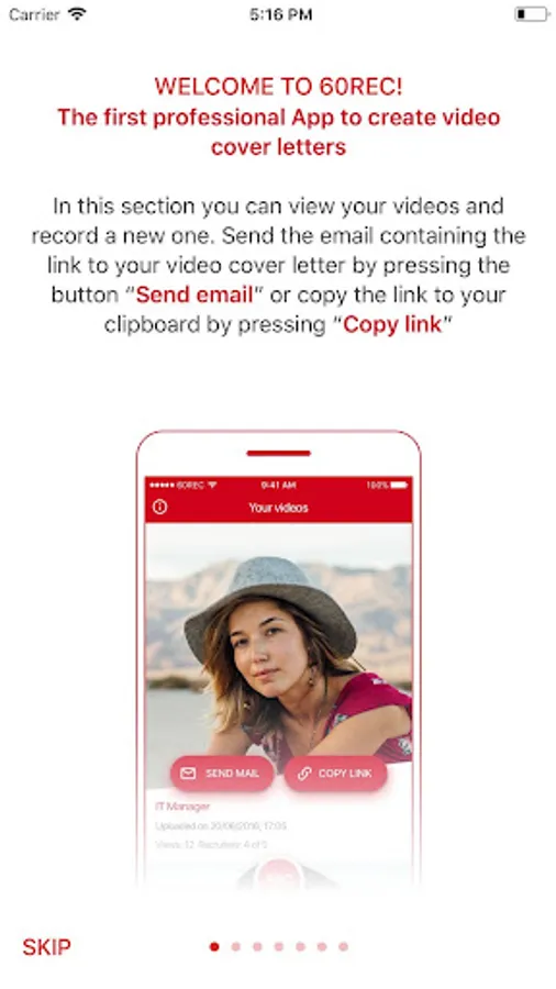 - Managing: with your account you will be able to manage your videos on both the mobile App and 60REC online platform (www.60rec.com). Video can be easily shared with recruiters with a short link copy and paste.
