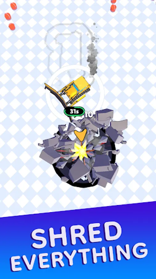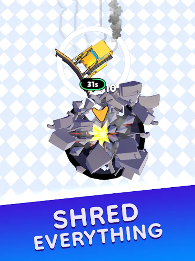"Take control and embark on an exciting mission to clean up the area! Your objective is to drop objects down the platform's wide hole or use the shredder to break them apart and create constructions with the scraps. Push objects with the bulldozer to increase its size, allowing you to handle even larger items as you progress.