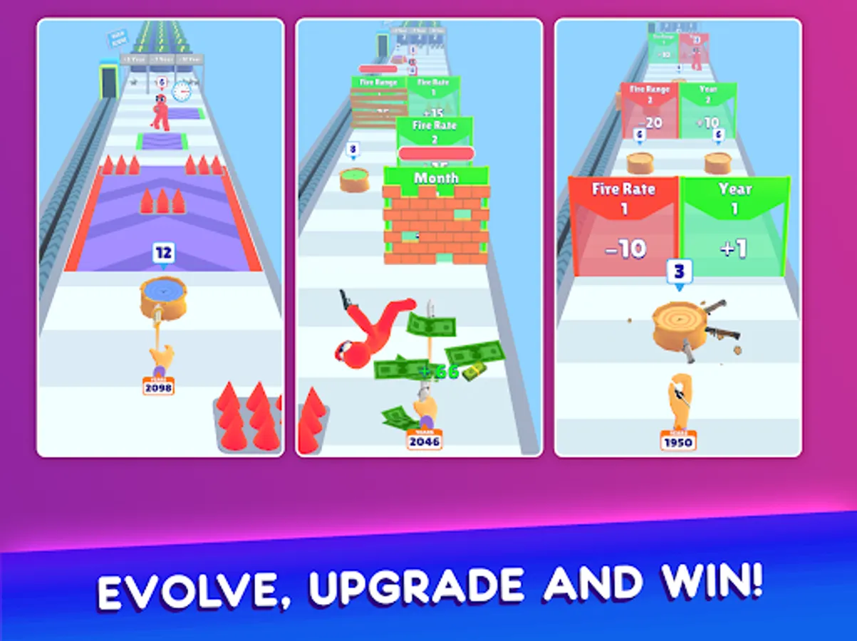 Your journey is all about mastering the art of knife-throwing. Upgrade your knife-throwing skills, including fire rate, range, and the evolution of your blades. Just like in your favorite game, Weapon Craft, you'll evolve your knives by landing perfect shots on rotating wooden logs. Watch as the logs hop onto a conveyor belt, filling evolution gates with your expertly thrown blades.