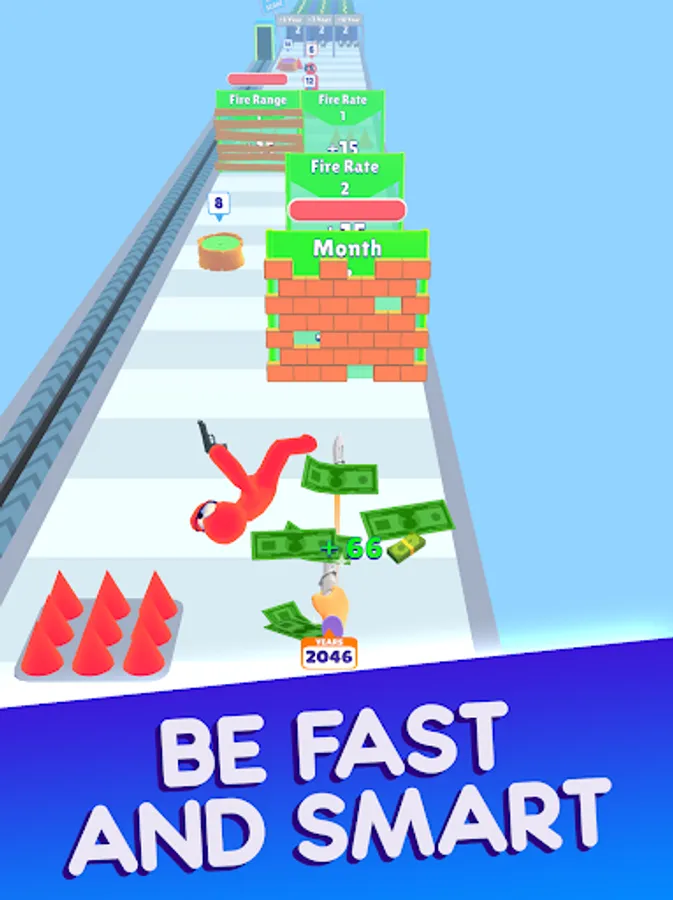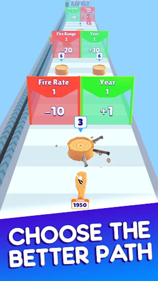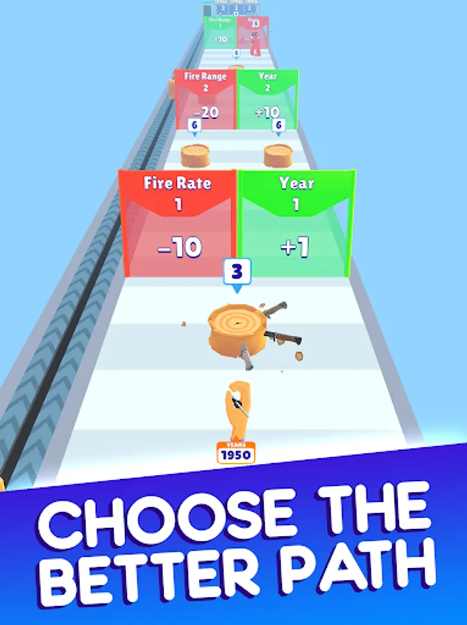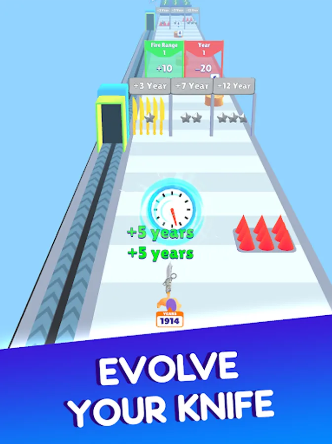 As your knives evolve, they become more powerful and look even cooler! Brace yourself for increased challenges as you progress through the levels. Encounter unique obstacles like gates with negative values (turn them positive with your hits), tough trapped gates (break them with multiple hits), gates on the move, and dynamic rotating logs.