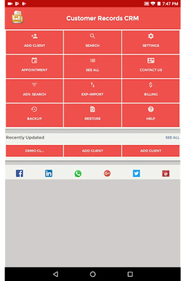 CRM Software to manage client contacts, notes, appointments and bills on the go. Calendar, Assistant and messaging integration. Push Notification for TO-DOs or tasks. SMS and Email notification for appointments and billing reminders. NO Internet, NO Data Plan, NO Mobile network needed. Design your App with custom fields. App works in offline mode on both tablets & phones. Have client in your pocket! Grow your business with effective customer relationship management while on the go.