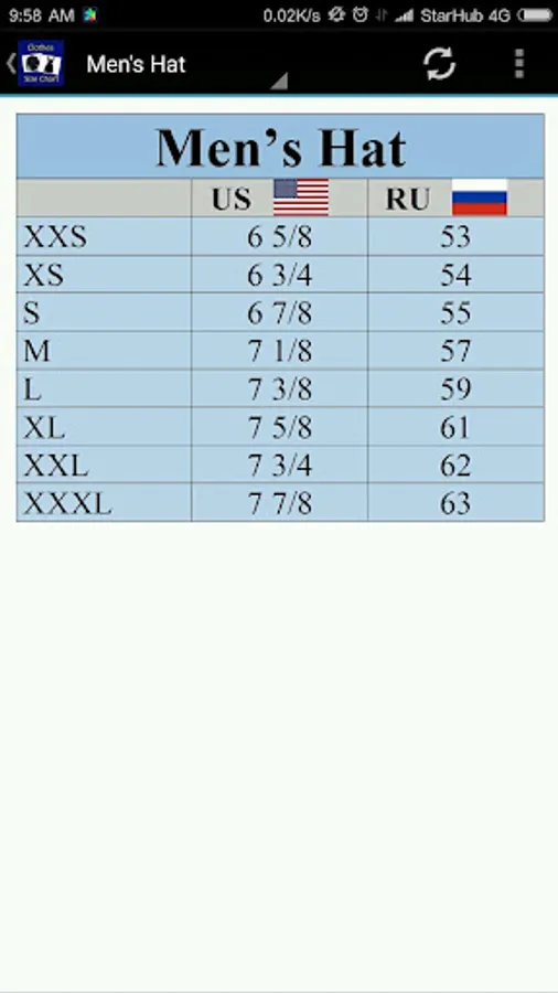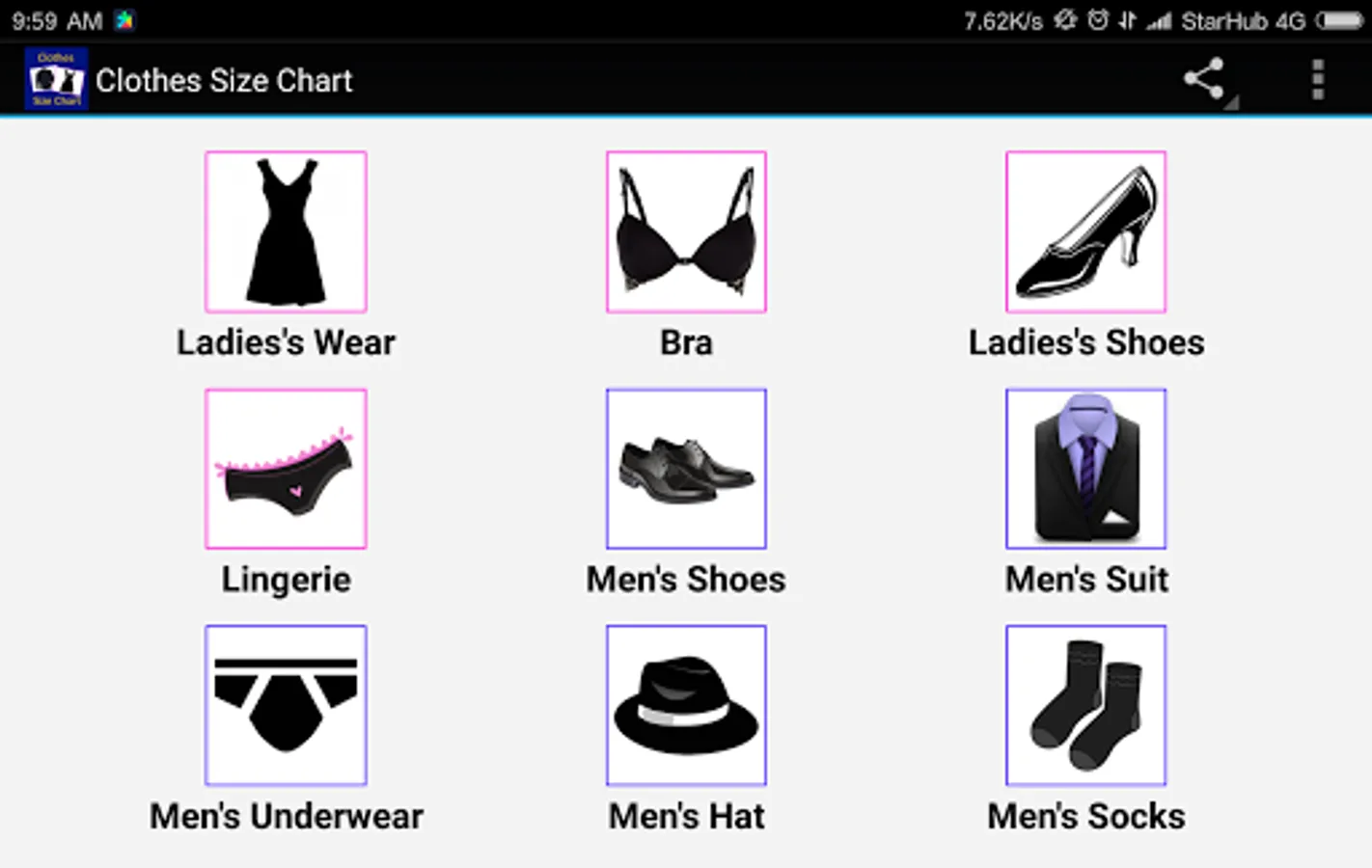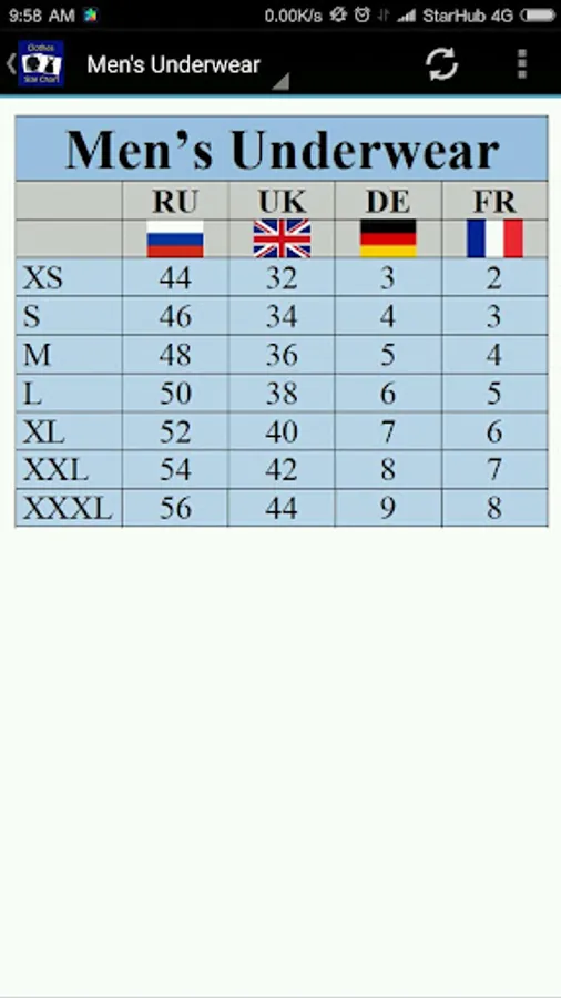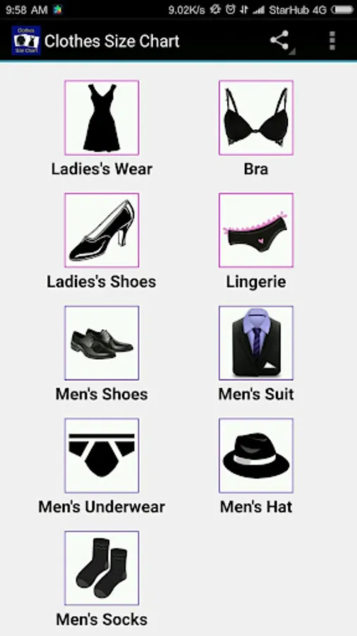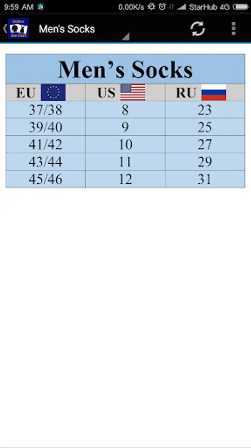 Clothes, Bra, Socks Size Chart Screenshots