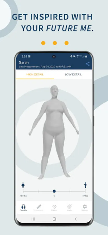 With just two images, from the front-and-side, you can begin to see your body’s transformation with each scan. You can then compare those scans side-by-side or use the Future Me feature to find your aspirational body.