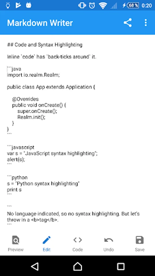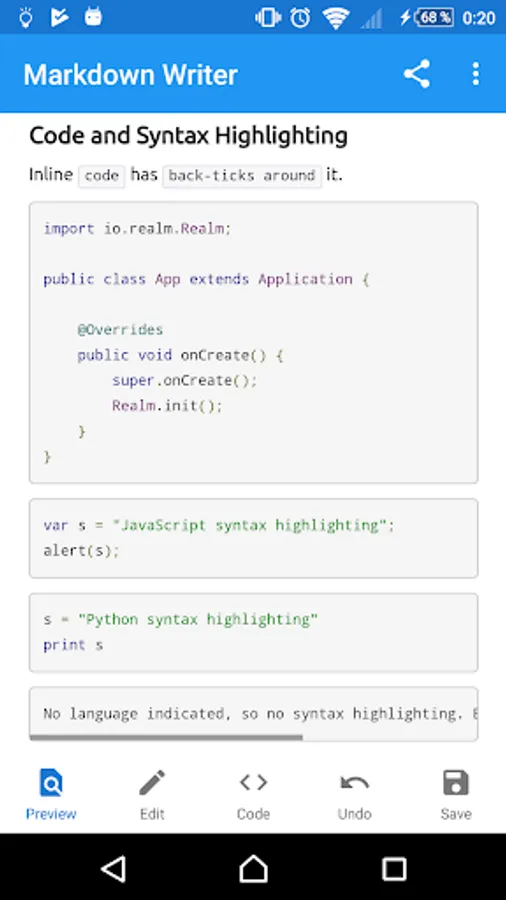 - Markdown syntax (titles, code, lists, tables, blockquotes, ...).