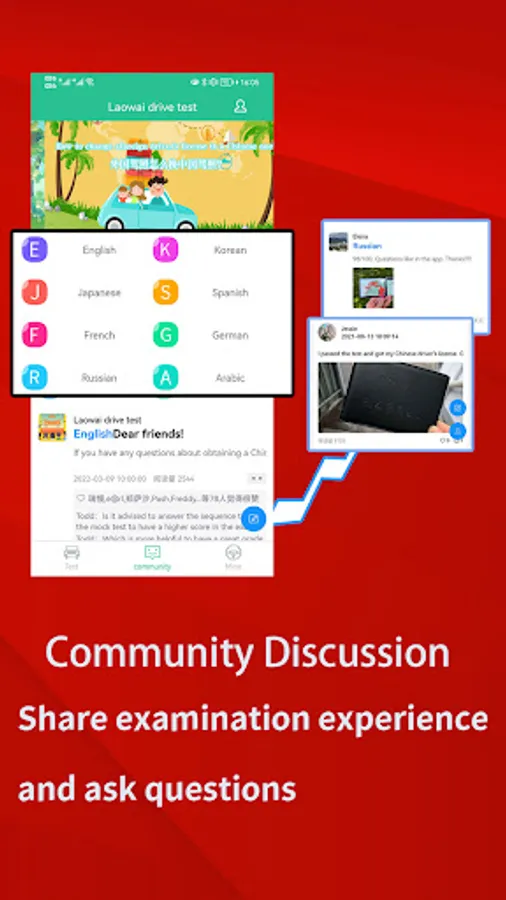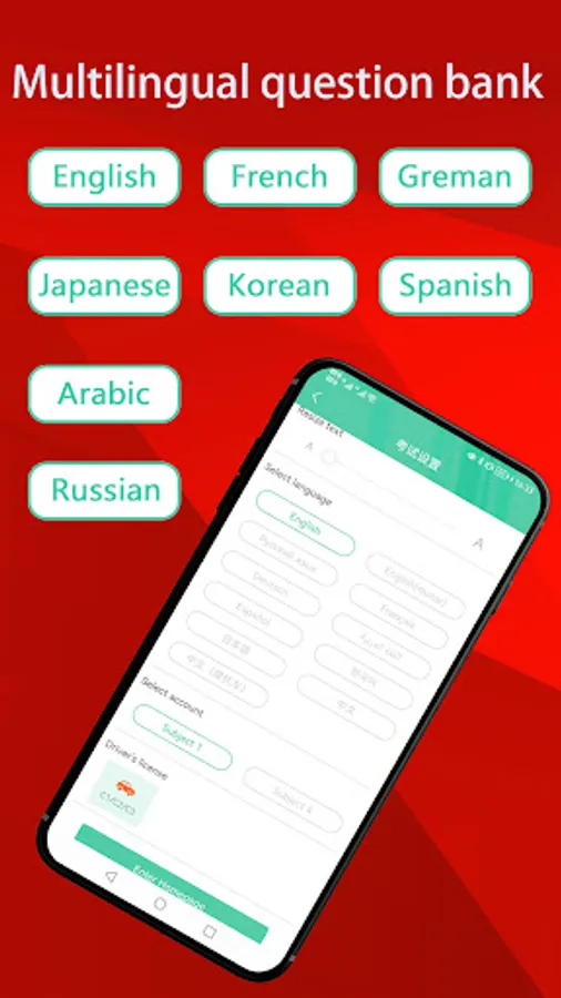 There are nine language test banks in the foreigner driving test APP, including English, French, German, Japanese, Korean, Russian, Spanish, Arabic and Chinese.