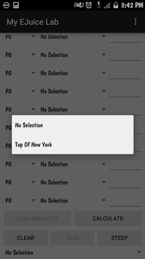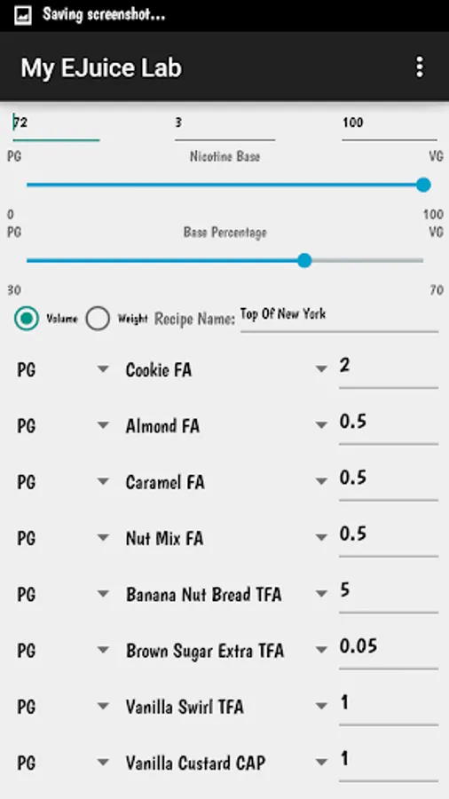 Volume & Weight, add up to 10 flavours per mix, easy to input your requirements and you can even set defaults so you don't have to repeat yourself per mix. If you don't have any Berry Crunch (TPA) left for example, it won't display in the selection, no more finding out at the last minute you haven't got enough. You can also adjust the weights of your PG/VG/Nic/Concentrates to you can be as accurate as you like!