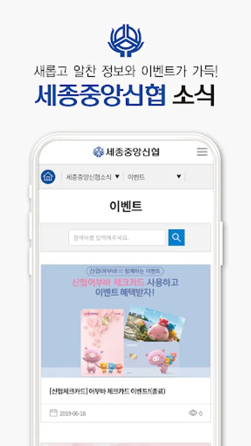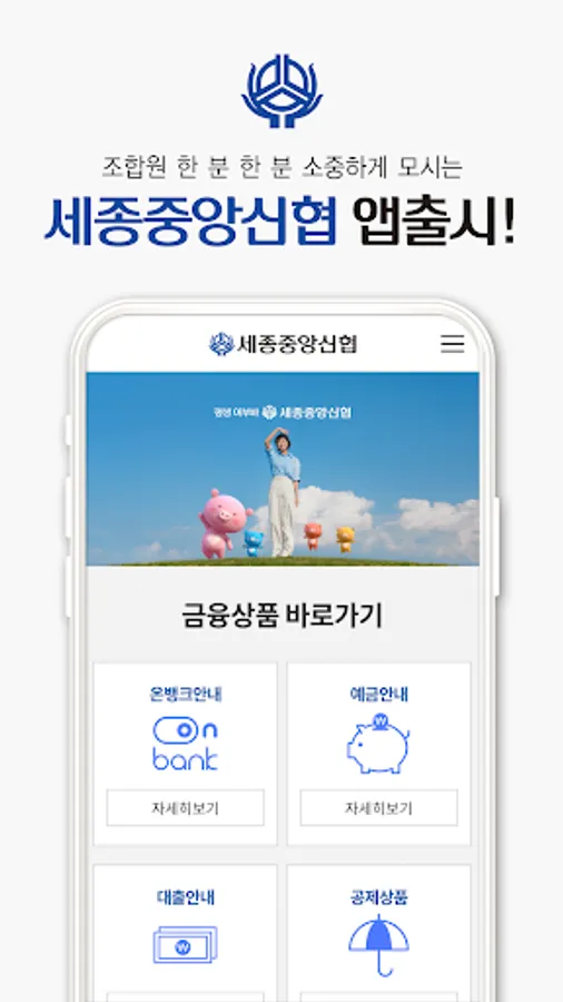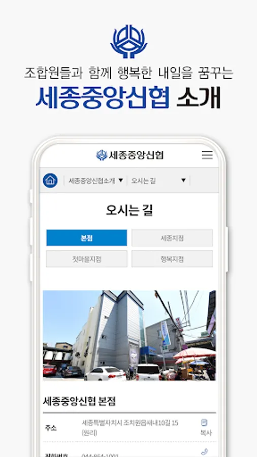 Where there is the joy of living together and sharing, the center of Sejong Central Credit Union is always people. The Sejong Central Credit Union app provides information on financial services such as deposit services, loan services, affiliate cards, deductions, and other related information such as branch locations, and allows you to conveniently receive announcements and event notifications.