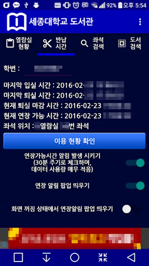 2. 열람실 연장시간 자동체크기능