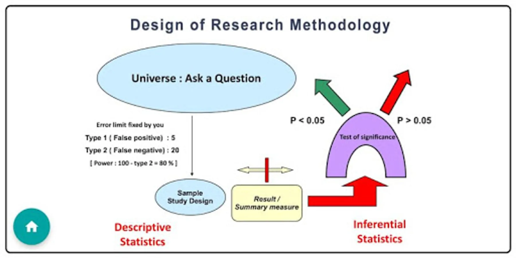 After this, a highly interactive window opens. This channels the thinking process of the user to accurately choose the most appropriate research pathway to answer a particular research question. Each pathway comprises of blank templates with prompts, schematic visuals of data patterns, information required for sample size calculation, summary measures and tests of significance specific for the chosen domain of research. If the user goes into a wrong pathway, the flow gets interrupted and prompts the user to start again. This process iterates till the most appropriate research methodology for a given research question is selected. This ensures that the user is guided to the correct research domain.