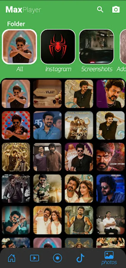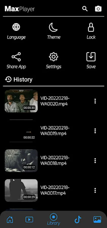 It is a Video player with a music player on top of it and you can see your photos .There are 3 buttons on the fast screen for playing fast music and then you can see the videos on your phone as video reels and the second button you can see the photos on the 3rd button. Then there is the bottam bar which has 5 Screens and on the second screen you can see all the videos and movies. Thirdly there is a button to change the language on the screen and then there is a button to change the theme and then you can save all the videos, music and photos on your phone. That is the look button. And the settings button. Then you can see the video history below the App share button. You can play music on the 4th screen. You can see the photos on the 5th screen