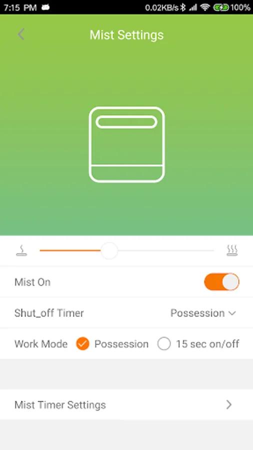 Mist control: adjust mist volume and select continuously / intermittent mist and timer selection.