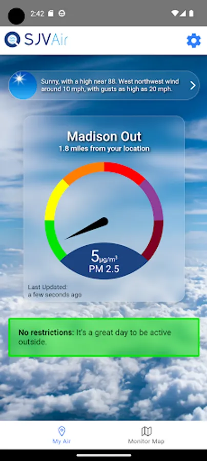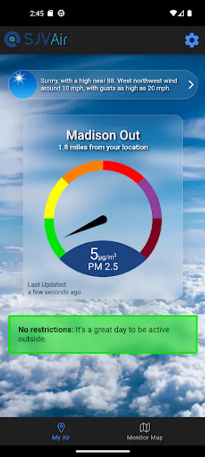 Keep any eye on your local air quality and receive outdoor activity guidelines based on hourly fine particle pollution (PM2.5) concentration. Going out for the day? Enable "Auto Update" in the app's settings menu and get live notifications when you enter hazardous air!