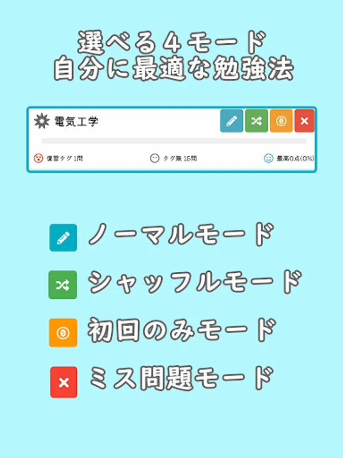 ・ In "Shuffle mode", the questions are the same as in normal mode, but the order in which the questions are asked is random. Prevents you from remembering the answers in the order of the questions.