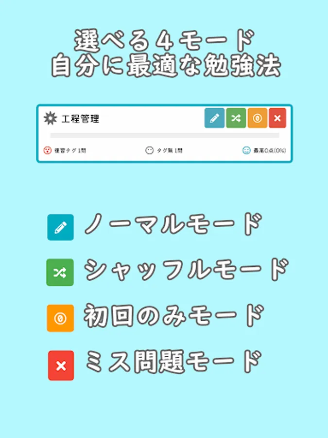 ・ In "Shuffle mode", the questions are the same as in normal mode, but the order in which the questions are asked is random. Prevents you from remembering the answers in the order of the questions.