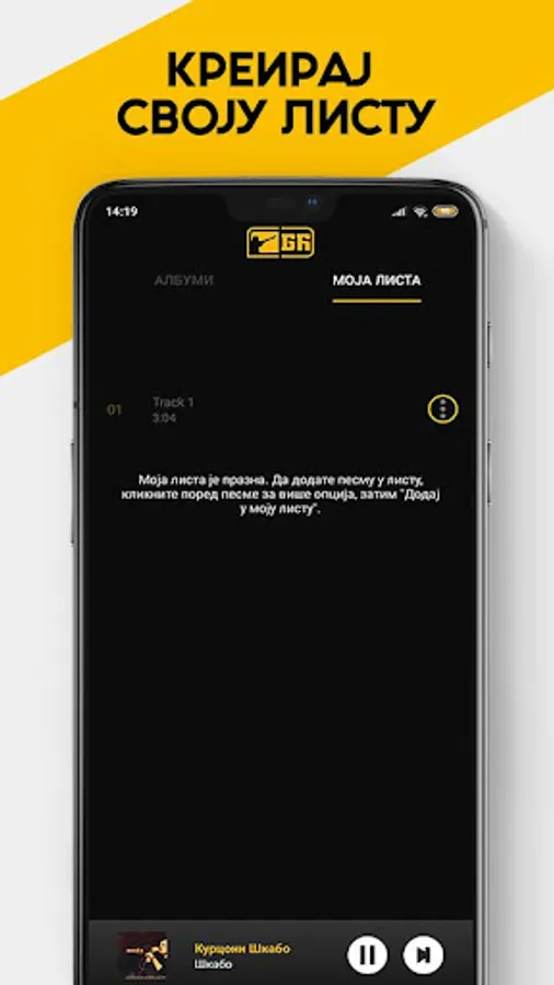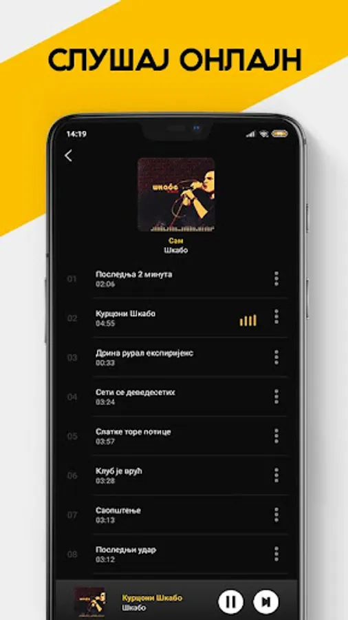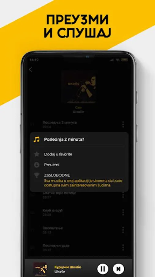 - Napravi sebi listu (my play list) i slušaj svoje omiljene Škabove hitove kad, gde, s kim god i kojim god redosledom poželiš poželiš (player radi u pozadini drugih aktivnosti na telefonu).
