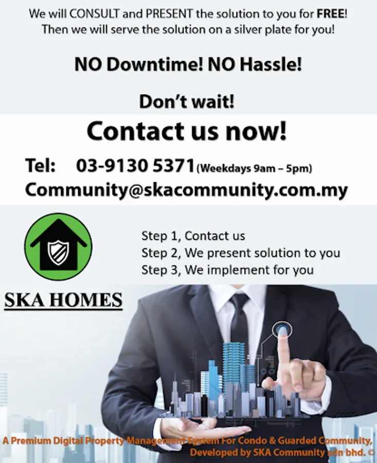 SKA HOMES's SERENITY, bring to your community a seamless dealing with your community management team. In short, it reduce the process for residence to engage the condo management, and solving the problem with a systematic mechanism.