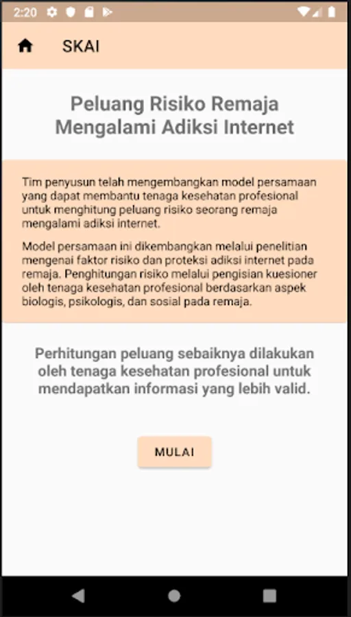 SKAI Score is an application to help health professionals calculate their risk opportunities for teens experiencing internet addiction. SKAI Score uses an equation model developed through research on risk factors and internet addiction protection in adolescents.