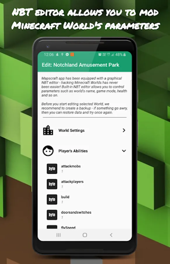 - built-in NBT editor for level.dat files allows you to mod and hack your Minecraft World's - just with one click,