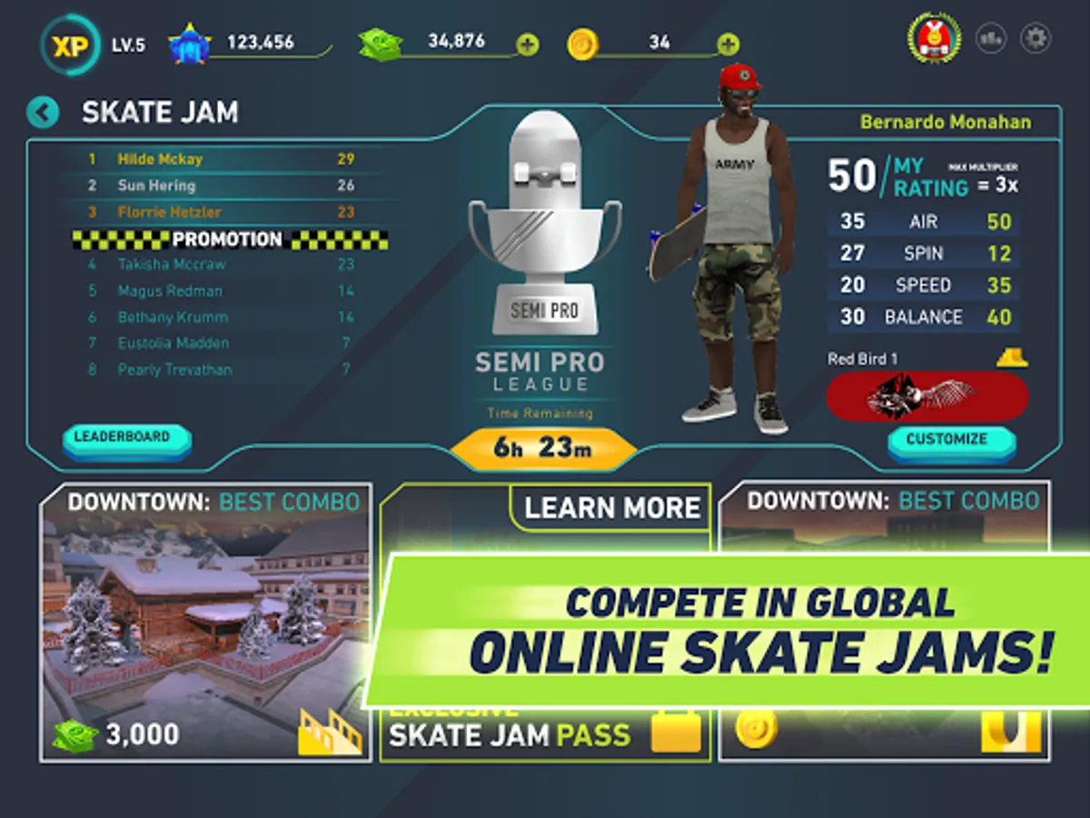 Explore different skate parks, unlock new boards and compete in global Skate Jam tournaments to become a legend. Download the game now and start your adventure, FREE to play!