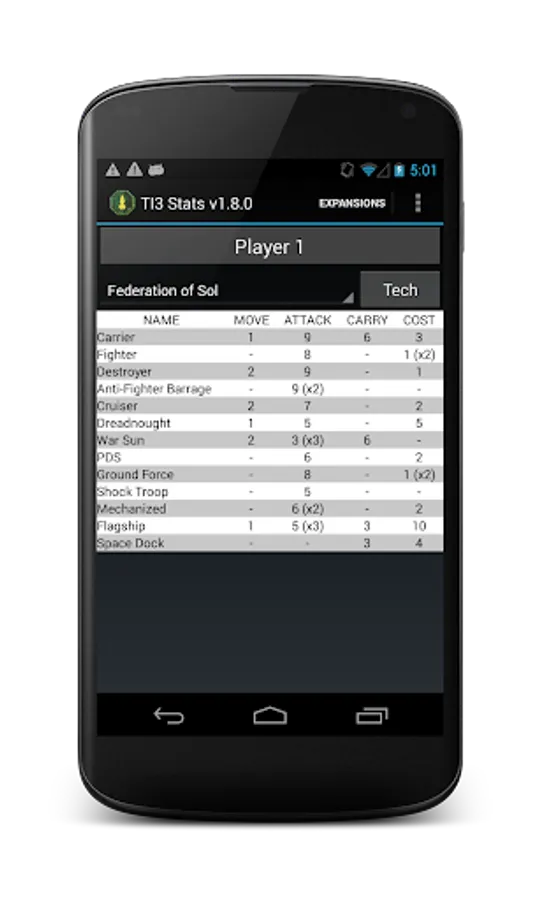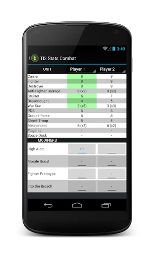 TI3 Stats Tracker is a simple app to keep track of all of the racial abilities and technology bonuses that apply to any of the ships or ground forces in the board game Twilight Imperium, 3rd Edition, by Fantasy Flight Games.