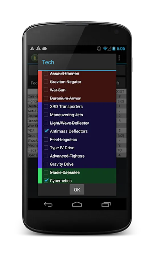 Swipe to the left and right to find players 1-8. Pick the race for each player. It will automatically set their starting technologies and adjust their unit stats appropriately. As each player acquires technology, click the “Tech…” button for that player and check the appropriate technology. Their unit stats will be automatically adjusted.