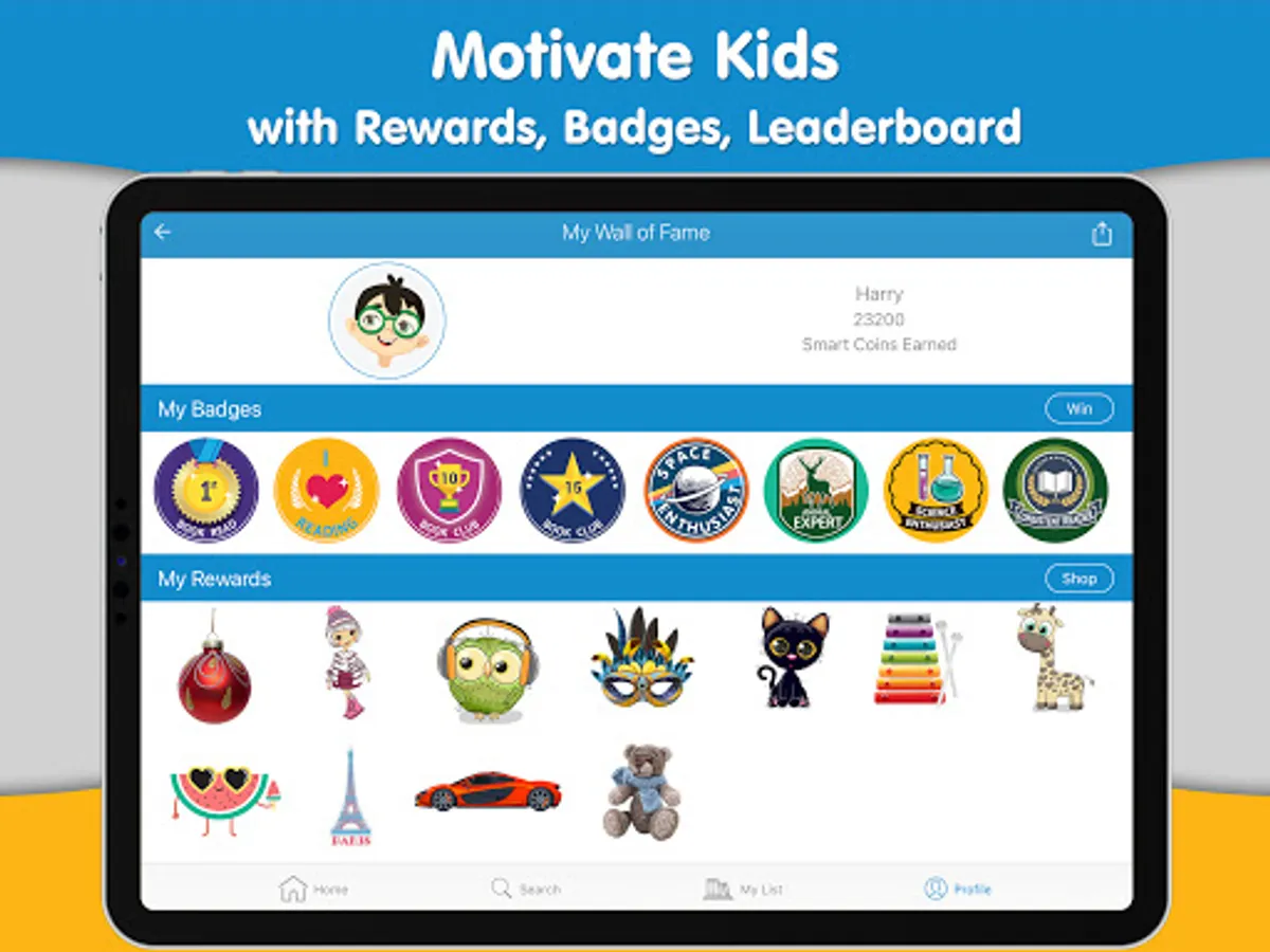 The app motivates kids with badges, encourages kids with rewards, engages and challenges kids with leaderboard.