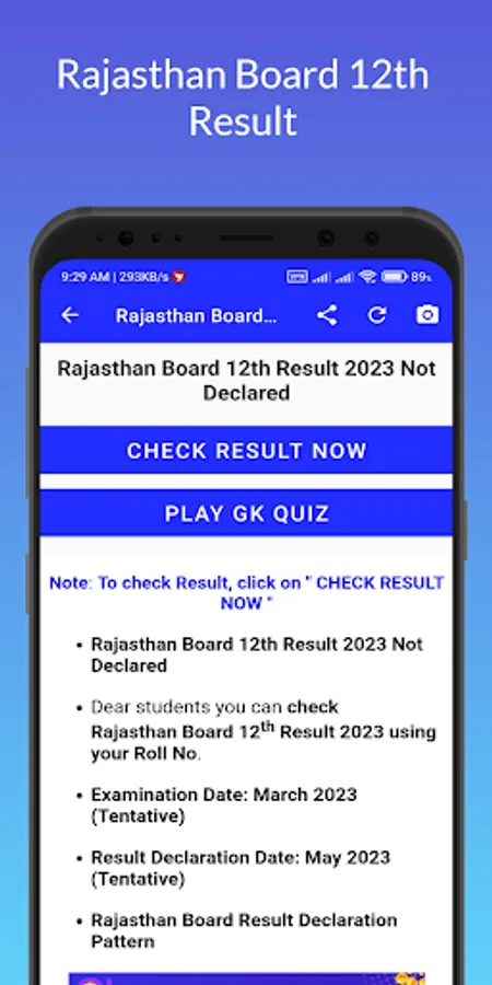 Disclaimer Note: Application is not a official app of Rajasthan Board result. This app contains only the Web View system, in which we display the Website into app. So, If any error you face, regarding Rajasthan Board Results 2023 Please contact to your respective ones or website Owner.