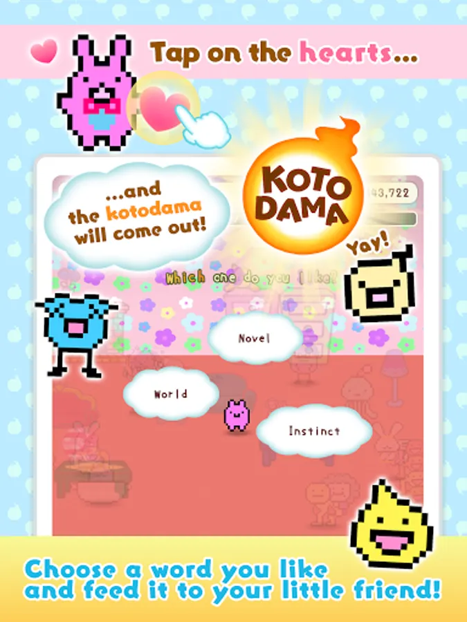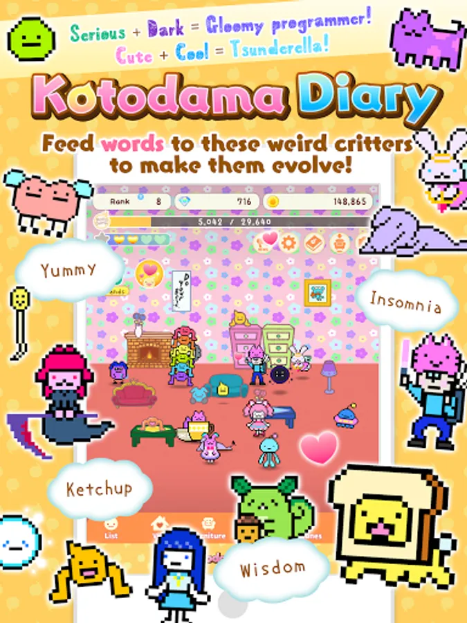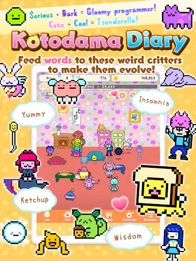 Kotodama Diary is a simple but entertaining virtual pet game that lets you have fun with bizarre characters that evolve depending on your word choices!