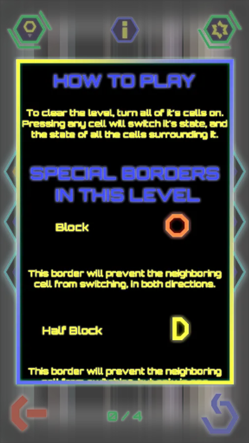 Test your brain with lots and lots of fun levels, simple to understand, but challenging to solve! There is one simple rule, every cell you press changes its state, and the state of all the cells around it, all you need to do, is turn them all on! As you advance to harder challenges, some cells get special functions that change their behavior and make the puzzle more complex.