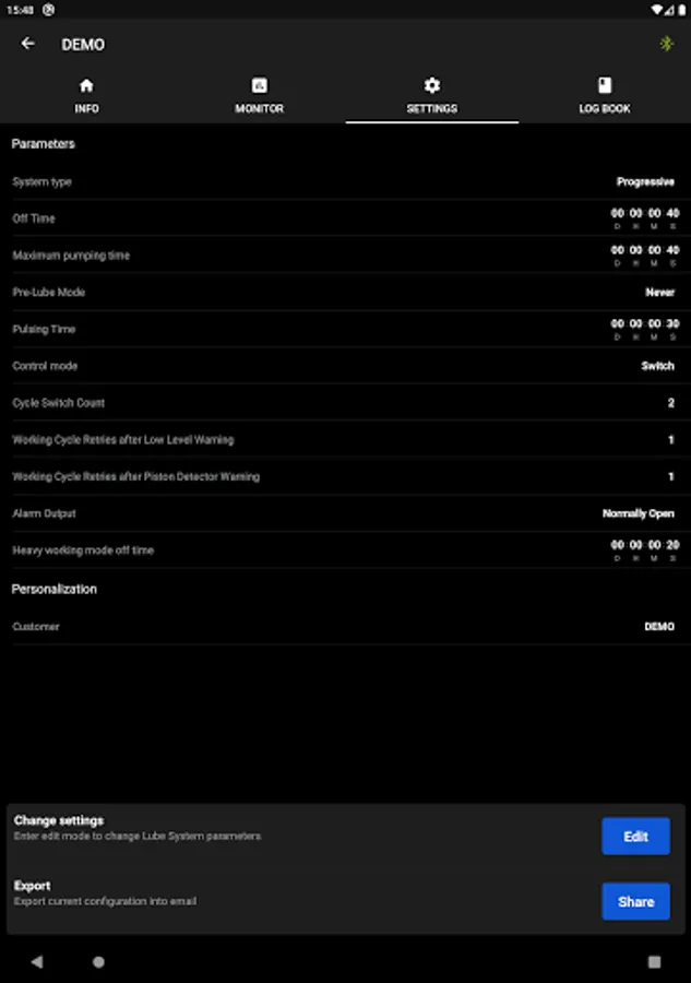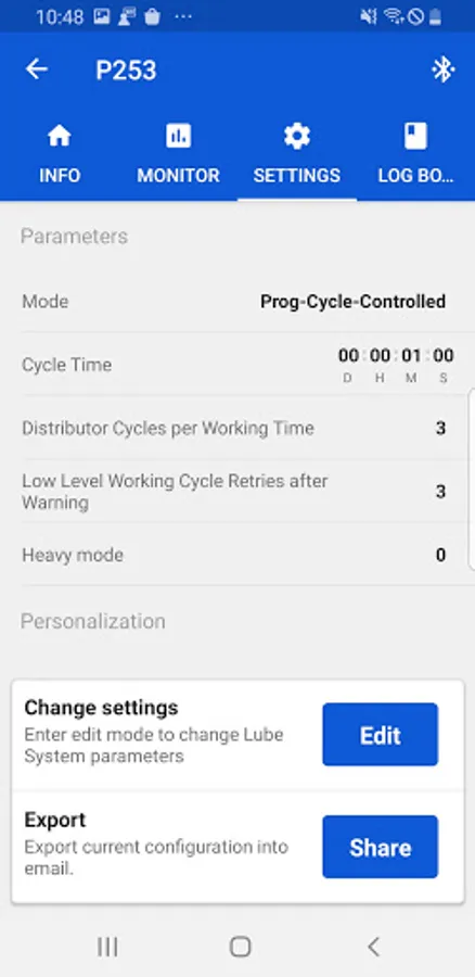 For each product you can edit and apply settings like cycle time and number of cycles per working time (depended on eLube device).