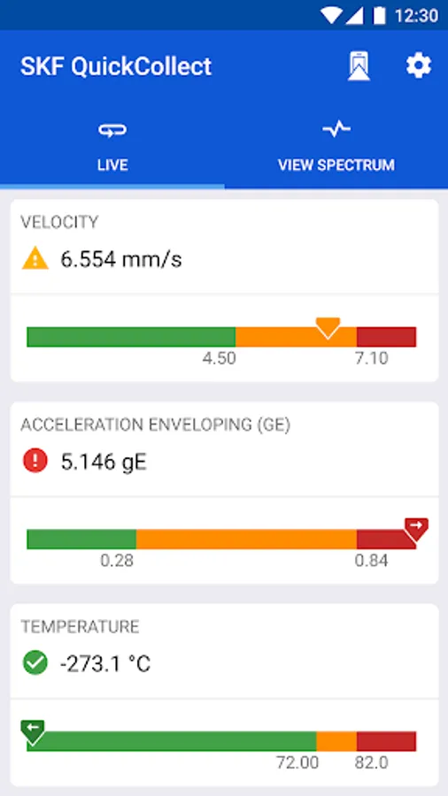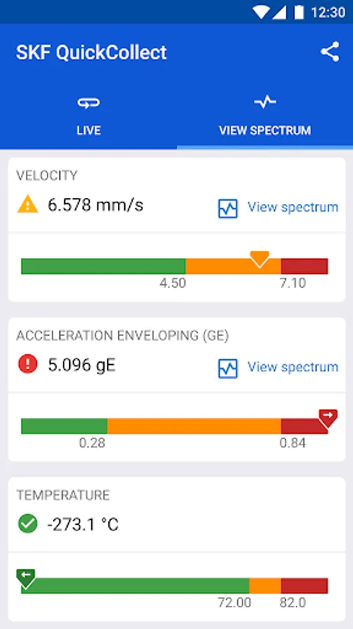 Used together with the SKF QuickCollect sensor, the app can collect, store and share machine health data of vibration and temperature. Users can set alarm thresholds or use SKF and industry standards to determine machine condition.