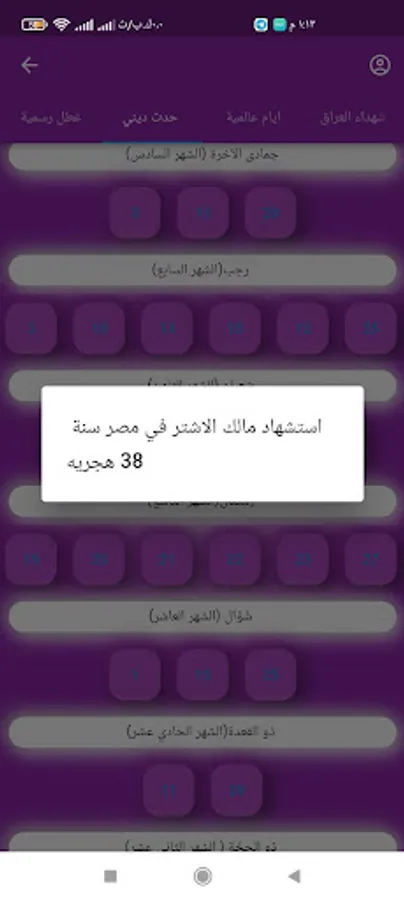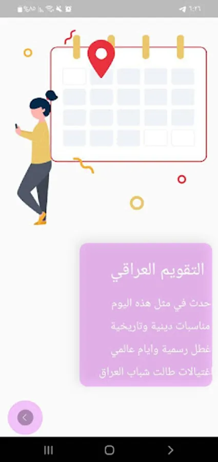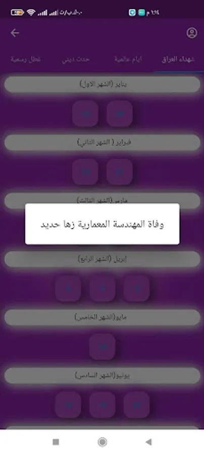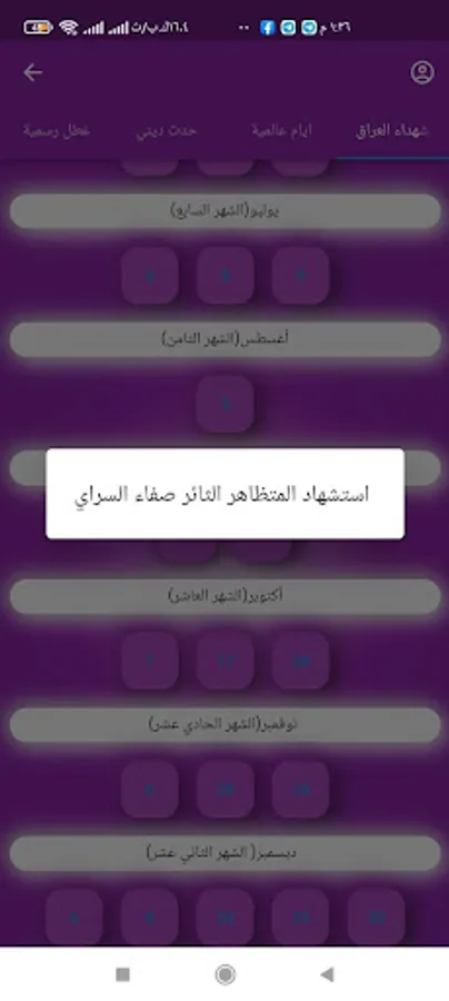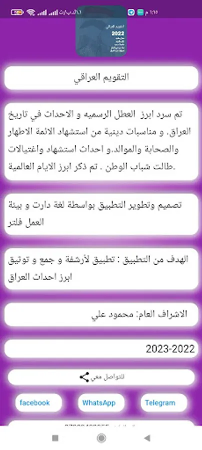 The Iraqi application contains the most prominent official holidays issued by the Iraqi state, the most prominent religious events and international days issued by the United Nations, as well as the most prominent events in Iraq and the date of death and martyrdom of the most prominent personalities and leaders.