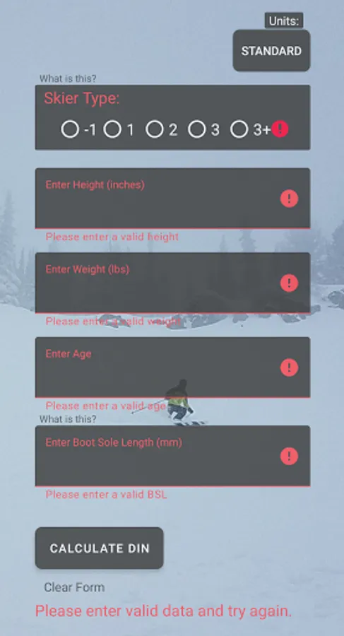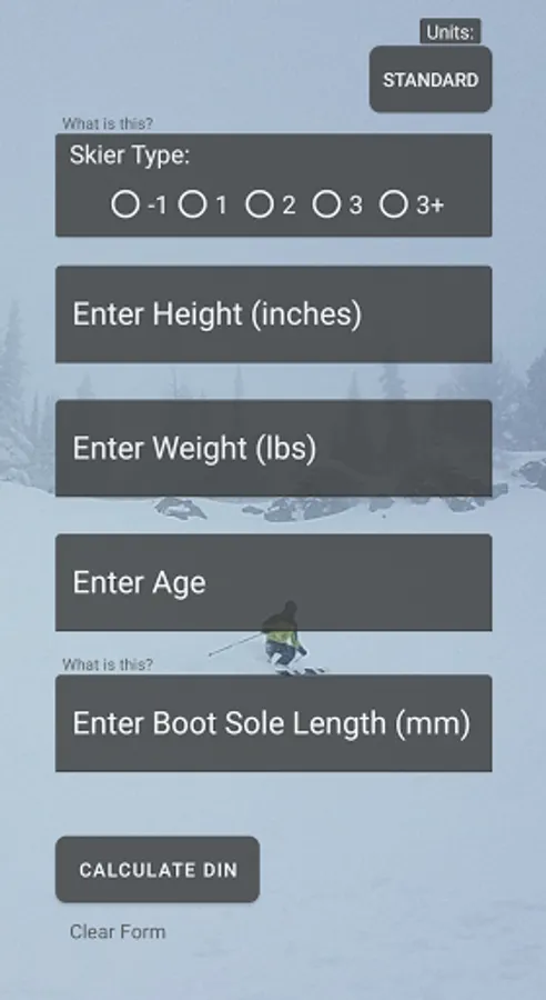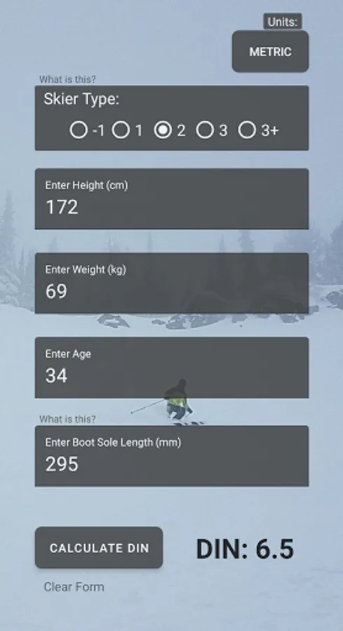 This app can calculate your recommended ski binding release tension (DIN) based on age, height, weight, skier type*, and boot sole length**. It can accommodate measurements provided in either metric or standard units.